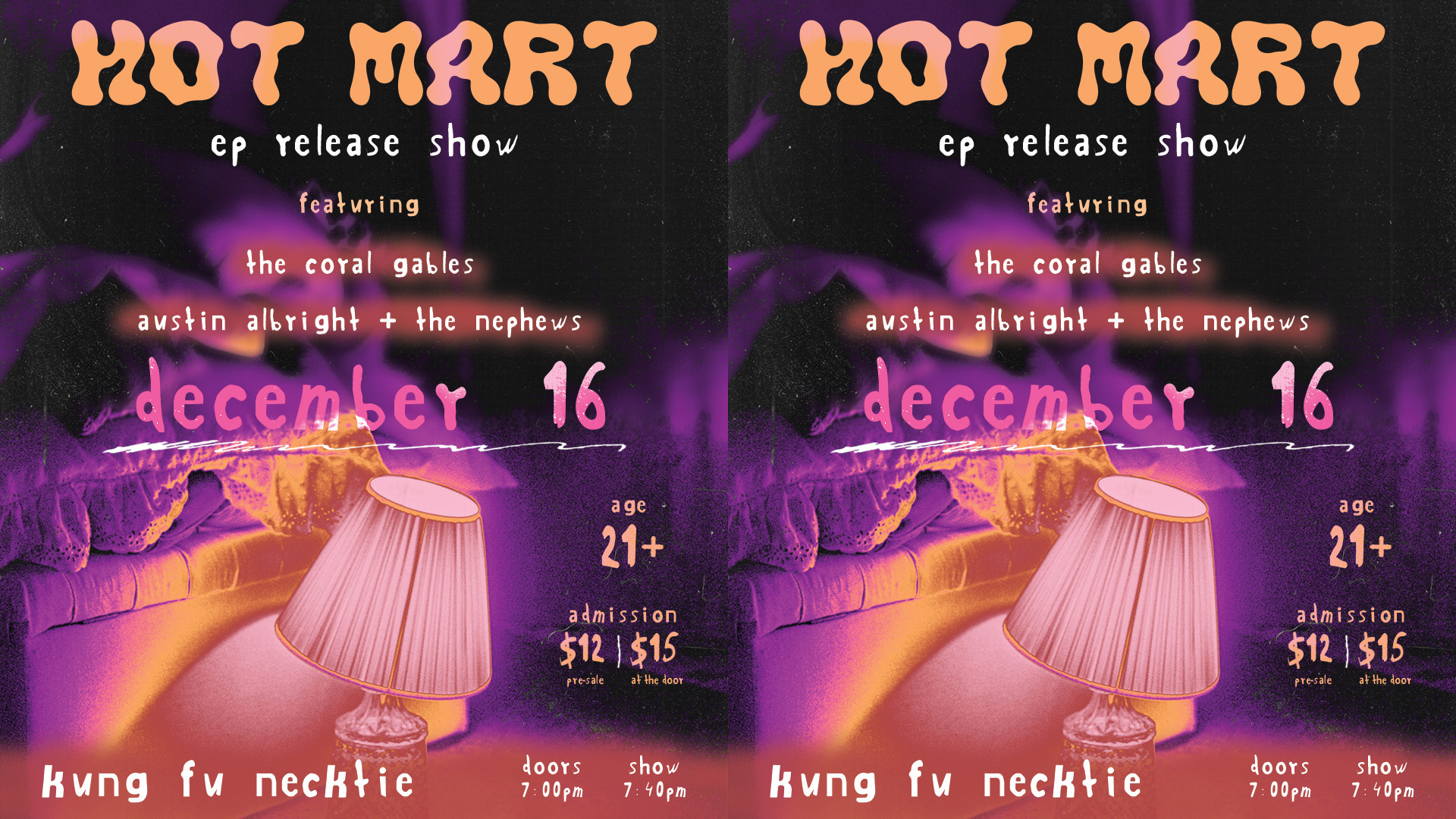 In Fall 2022, I was approached by Hot Mart’s frontwoman Dani Bruno to design promotional graphics for their EP release show at Kung Fu Necktie in Philadelphia. The event took place in December 2022 and featured other acts such as Coral Gables and Austin Albright + The Nephews. Using their original logo and some personal photography provided from the band, I wanted to evoke a grunge yet ethereal feeling.